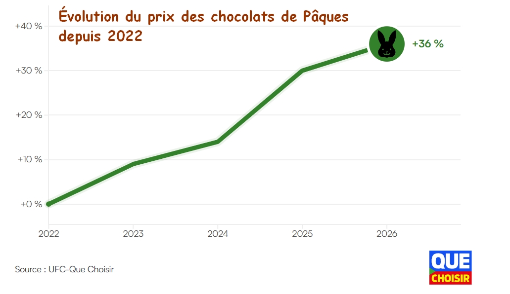 Cette année à Pâques, la surprise ne sera pas seulement dans l’œuf en chocolat mais aussi à la caisse. Les lapins, poules et autres friandises chocolatées coûteront en moyenne 4 % plus cher que l’an dernier. Une hausse qui peut sembler faible, mais qui n’est pas anodine dans un contexte où l’inflation alimentaire est presque nulle.