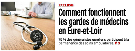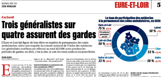 Selon un article publié par le quotidien régional l’Echo Républicain, « l’Eure-et-Loir fait figure de bon élève en matière de permanence des soins ambulatoires, selon une enquête du conseil national de l’ordre des médecins. Les généralistes euréliens ont effectué au total 422.000 actes pendant les périodes de gardes, en 2025, c’est-à-dire, le soir, les week-ends ou les jours fériés ».
